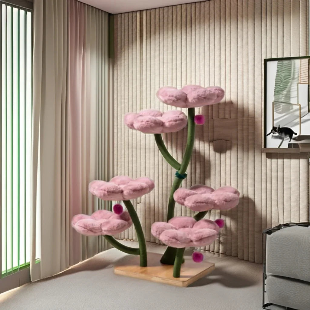 De opvallende kleuren en bloemvormige platforms maken het een opvallend meubelstuk voor huisdieren dat plezier en functionaliteit in elke kamer brengt.