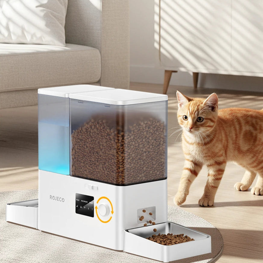 Make feeding easy and smart with the ROJECO 2-in-1 Automatic Pet Feeder & Gravity Water Fountain. This innovative system combines a 5L food dispenser with a 3.5L gravity-based water drinker, keeping your dog or cat fed and hydrated — even when you're not home.